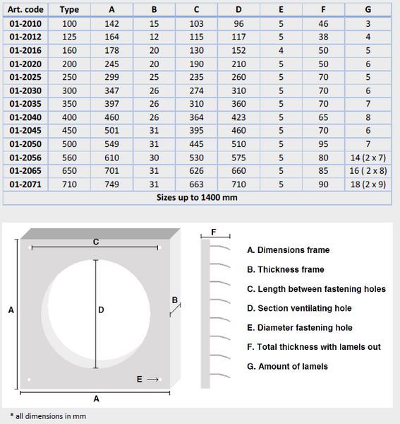 Buitenmaat: 610mm x 610mmLengte lamel: 2x 273mmAantal lamellen: 2x 7